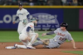 Seattle Mariners shortstop J.P. Crawford (3) tags out Detroit Tigers second baseman Colt Keith (33) as he tries to steal second base during the fourth inning in Game 5 of baseball's American League Division Series Friday, Oct. 10, 2025, in Seattle. (AP Photo/John Froschauer)
