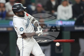 Seattle Mariners second baseman Jorge Polanco hits the game-winning RBI single during the 15th inning in Game 5 of baseball's American League Division Series against the Detroit Tigers, Friday, Oct. 10, 2025, in Seattle. (AP Photo/John Froschauer)