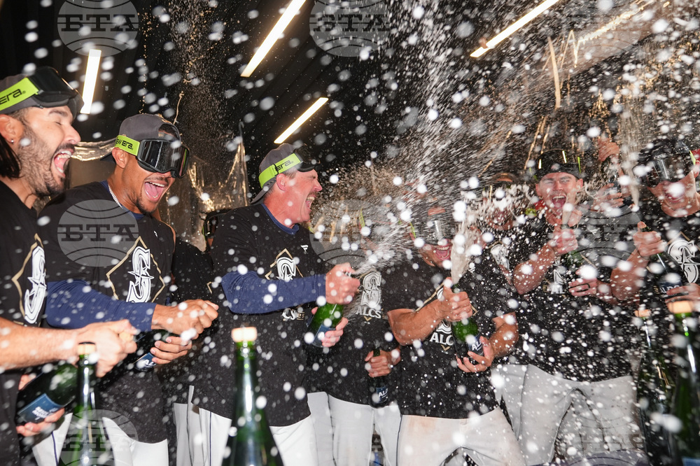 Seattle Mariners players celebrate after the team's win over the Detroit Tigers in Game 5 of baseball's American League Division Series Friday, Oct. 10, 2025, in Seattle. (AP Photo/Lindsey Wasson)