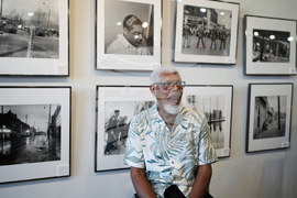Joe Calhoun poses in front of historical photos of the National Guard during the 1968 sanitation strike, Monday, Sept. 29, 2025, in Memphis, Tenn. (AP Photo/George Walker IV)