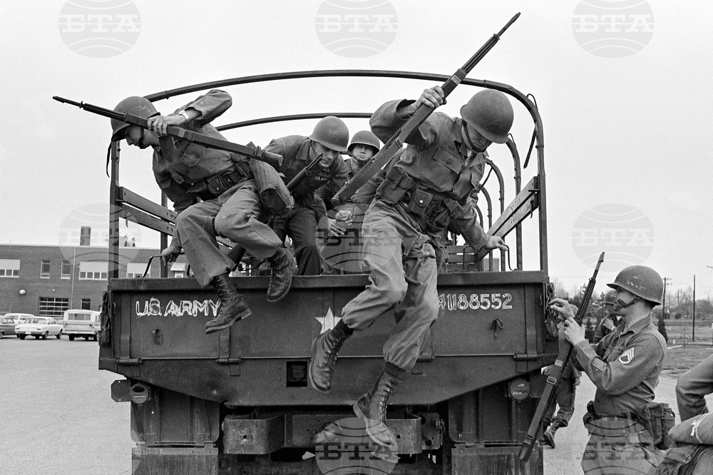 FILE - Tennessee National Guard troops leap out of a truck at the Memphis Armory after being ordered into the city by Gov. Buford Ellington at the request of city officials, March 28, 1968, in Memphis, Tenn. The guard was ordered after rioting and looting erupted midway through a march led by Dr. Martin Luther King Jr. in support of striking garbage workers. (AP Photo/Jack Thornell, File)