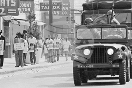 FILE - Tennessee National Guard troopers in jeeps and trucks escort striking Memphis sanitation workers during a march through downtown Memphis, Tenn., March 30, 1968. (AP Photo, File)