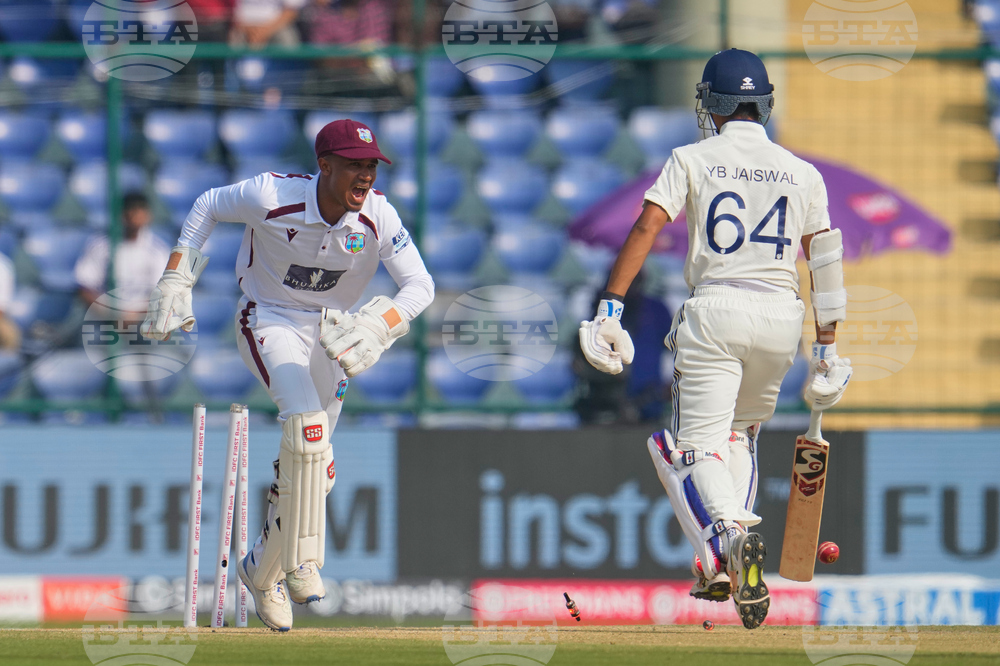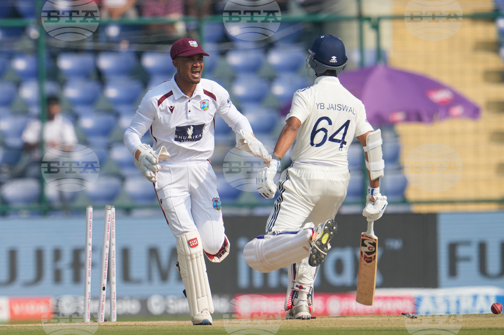West Indies' wicketkeeper Tevin Imlach takes the bails off of India's Yashasvi Jaiswal to make him run out on the second day of the second cricket test match between India and West Indies at the Arun Jaitley Stadium in New Delhi, India, Saturday, Oct.11, 2025. (AP Photo/Manish Swarup)