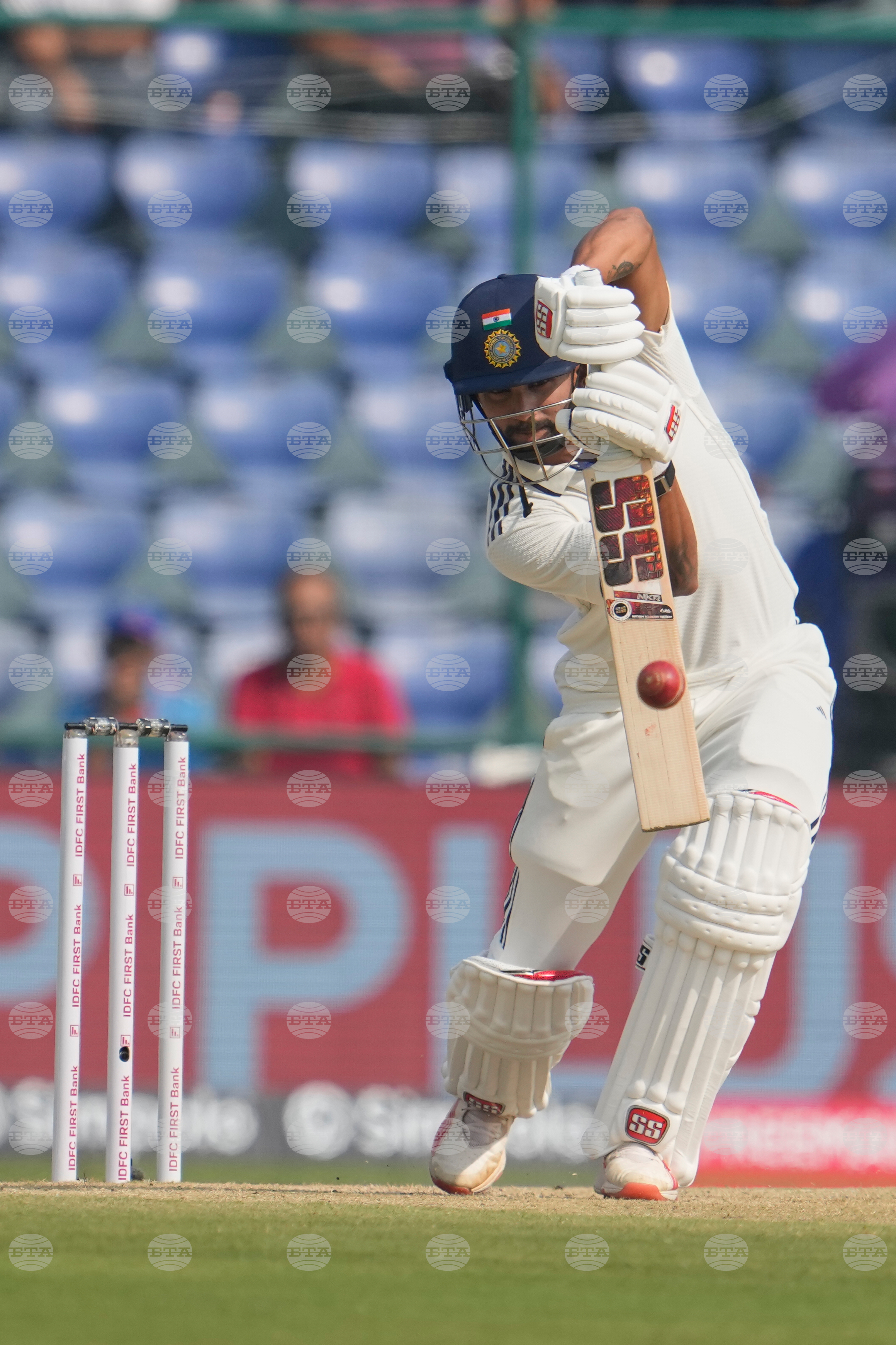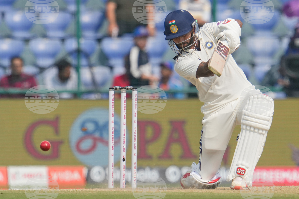 India's Nitish Kumar Reddy plays a shot on the second day of the second cricket test match between India and West Indies at the Arun Jaitley Stadium in New Delhi, India, Saturday, Oct.11, 2025. (AP Photo/Manish Swarup)
