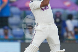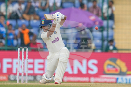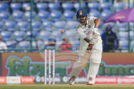India's wicketkeeper Dhruv Jurel plays a shoton the second day of the second cricket test match between India and West Indies at the Arun Jaitley Stadium in New Delhi, India, Saturday, Oct.11, 2025. (AP Photo/Manish Swarup)