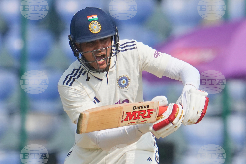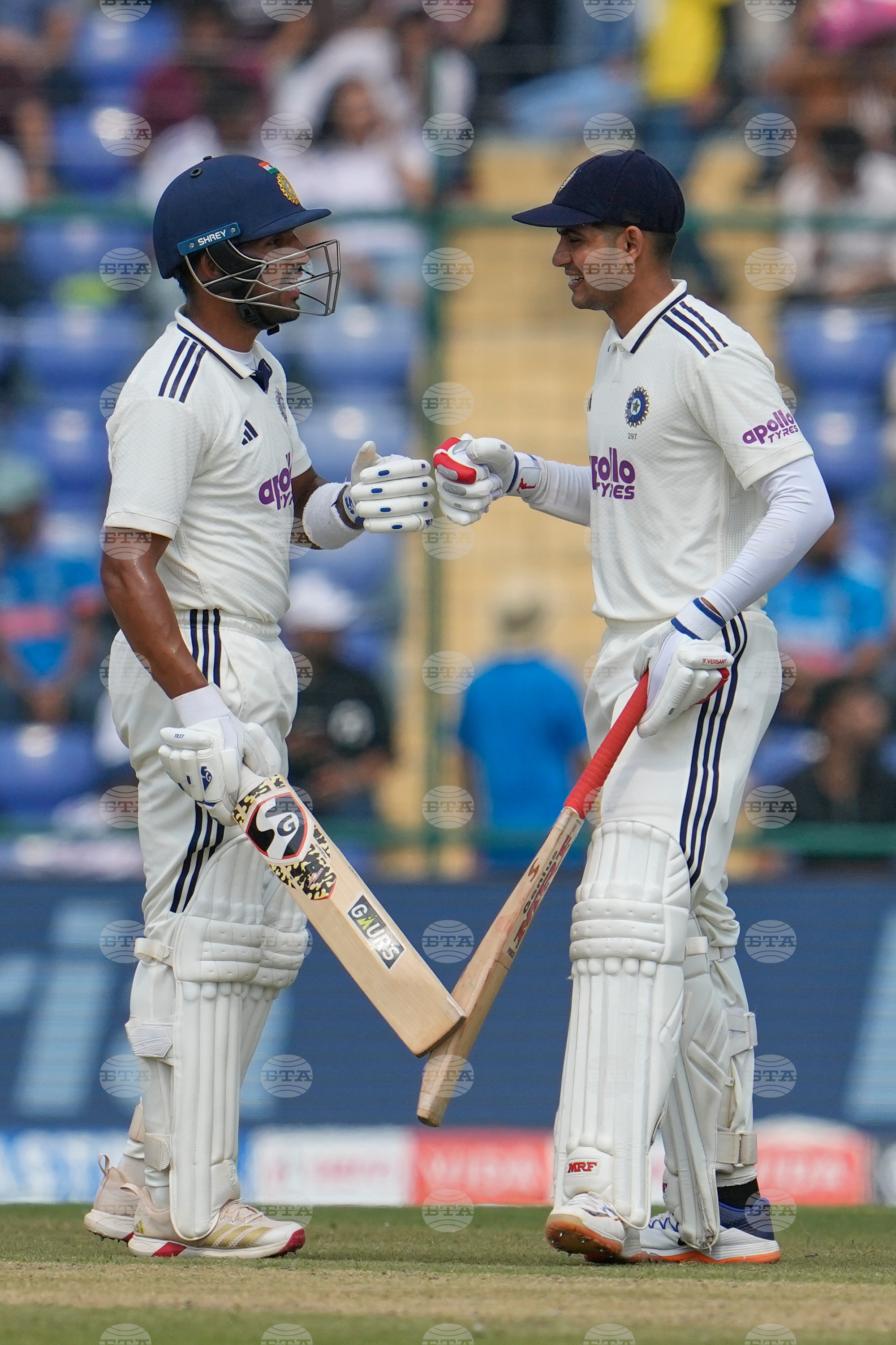 India's captain Shubman Gill and wicketkeeper Dhruv Jurel give the fist touch after scoring runs on the second day of the second cricket test match between India and West Indies at the Arun Jaitley Stadium in New Delhi, India, Saturday, Oct.11, 2025. (AP Photo/Manish Swarup)