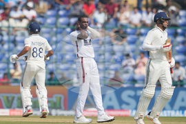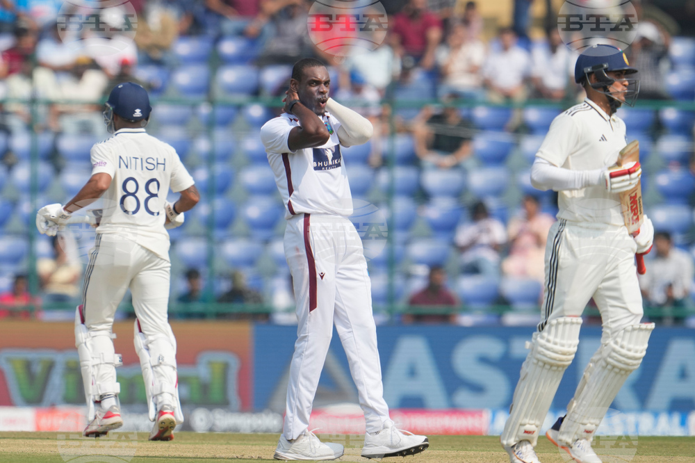 West Indies' Jayden Seales reacts after bowling a delivery on the second day of the second cricket test match between India and West Indies at the Arun Jaitley Stadium in New Delhi, India, Saturday, Oct.11, 2025. (AP Photo/Manish Swarup)
