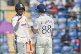 India's captain Shubman Gill gives the fist touch to Nitish Kumar Reddy after scoring runs on the second day of the second cricket test match between India and West Indies at the Arun Jaitley Stadium in New Delhi, India, Saturday, Oct.11, 2025. (AP Photo/Manish Swarup)
