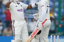 India's wicketkeeper Dhruv Jurel,left , hugs captain Shubman Gill on later's scoring a century on the second day of the second cricket test match between India and West Indies at the Arun Jaitley Stadium in New Delhi, India, Saturday, Oct.11, 2025. (AP Photo/Manish Swarup)