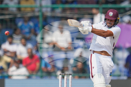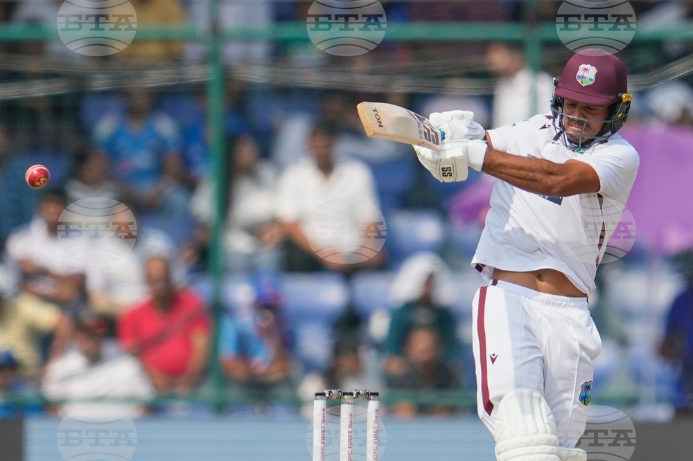 West Indies' John Campbell plays a shot on the second day of the second cricket test match between India and West Indies at the Arun Jaitley Stadium in New Delhi, India, Saturday, Oct.11, 2025. (AP Photo/Manish Swarup)