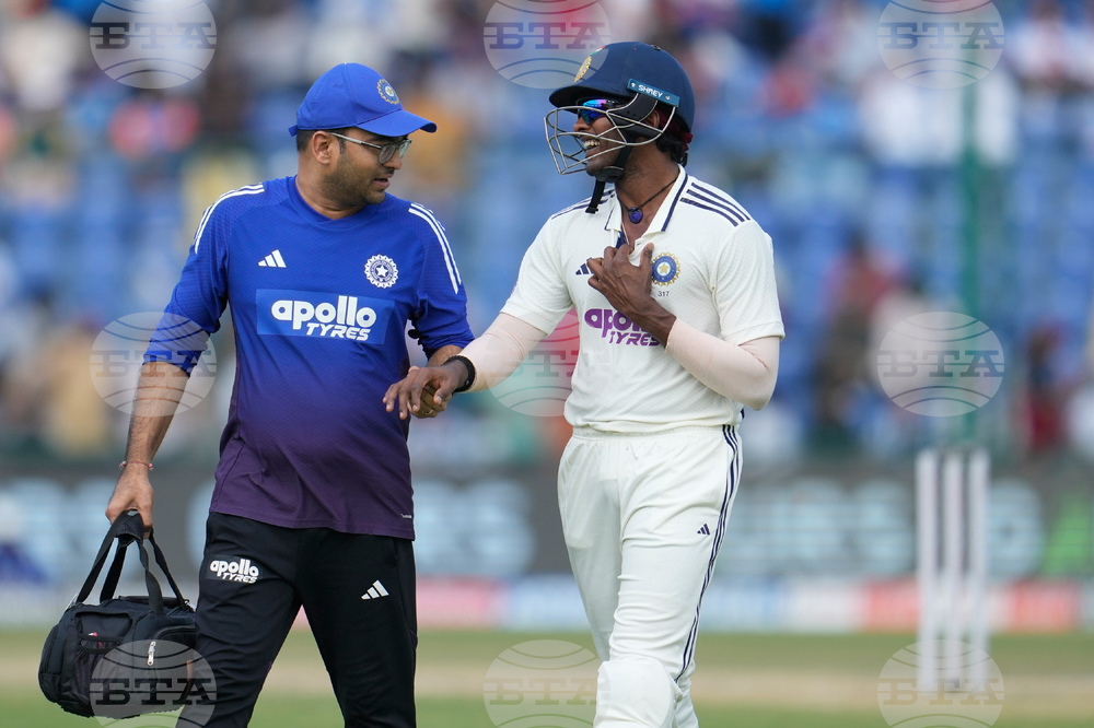 A team medic checks the fingers of India's Sai Sudharsan after Sudharsan got hurt while taking the catch of West Indies' John Campbell on the second day of the second cricket test match between India and West Indies at the Arun Jaitley Stadium in New Delhi, India, Saturday, Oct.11, 2025. (AP Photo/Manish Swarup)