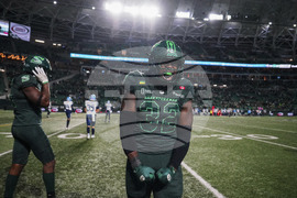 Saskatchewan Roughriders linebacker A.J. Allen (32) celebrates after defeating the Toronto Argonauts in a CFL football game in Regina, Saskatchewan, Friday, Oct. 10, 2025. (Heywood Yu/The Canadian Press via AP)