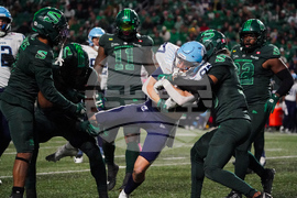 Toronto Argonauts receiver Jake Herslow (87) is tackled by Saskatchewan Roughriders defenders during the second half of a CFL football game in Regina, Saskatchewan, Friday, Oct. 10, 2025. (Heywood Yu/The Canadian Press via AP)