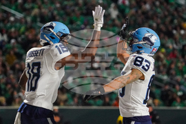 Toronto Argonauts receivers Dejon Brissett (18) and David Ungerer III (83) celebrate after scoring a touchdown against the Saskatchewan Roughriders during the second half of a CFL football game in Regina, Saskatchewan, Friday, Oct. 10, 2025. (Heywood Yu/The Canadian Press via AP)
