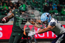 Saskatchewan Roughriders receiver Mario Alford (2) runs the football as Toronto Argonauts running back Felix Garand-Gauthier (38) defends during the second half of a CFL football game in Regina, Saskatchewan, Friday, Oct. 10, 2025. (Heywood Yu/The Canadian Press via AP)