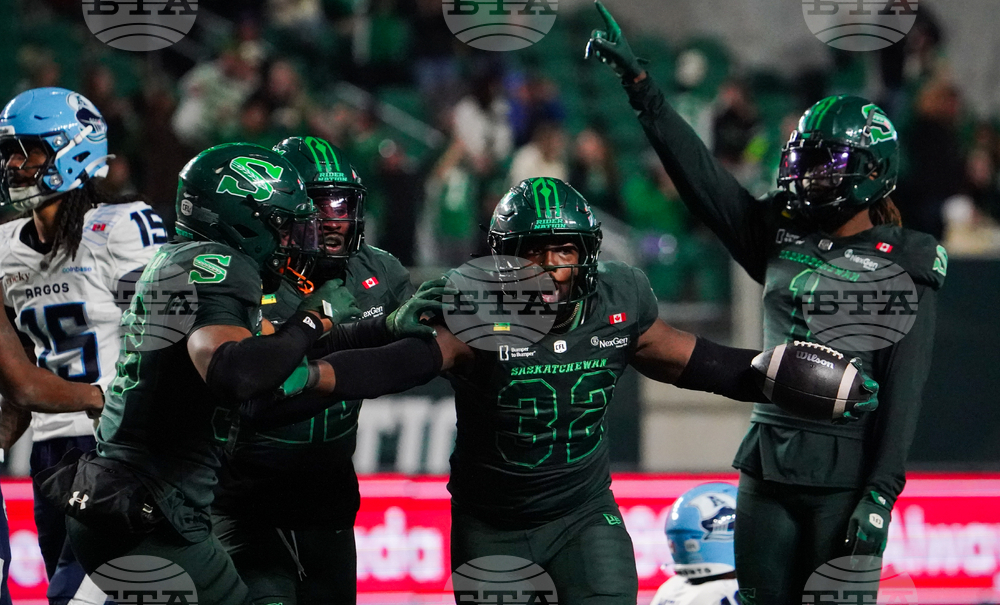 Saskatchewan Roughriders linebacker A.J. Allen (32) celebrates after intercepting the football during the second half of a CFL football game against the Toronto Argonauts in Regina, Saskatchewan, Friday, Oct. 10, 2025. (Heywood Yu/The Canadian Press via AP)