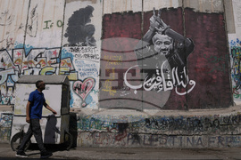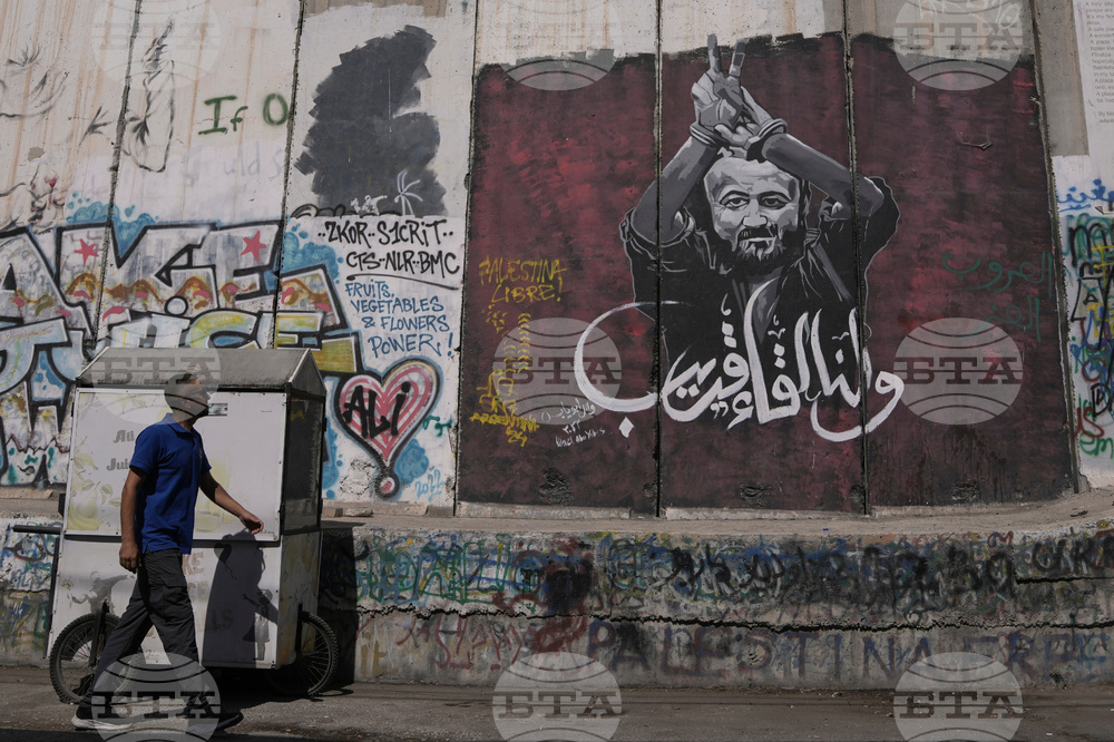 FILE - A man walks past a mural depicting the Palestinian leader Marwan Barghouti, with a message that reads in Arabic, "See you soon,” on Israel's separation barrier in the West Bank city of Bethlehem, Aug. 20, 2025. (AP Photo/Mahmoud Illean, File)