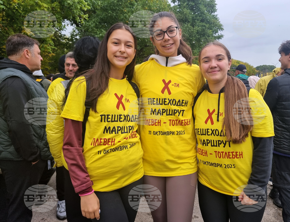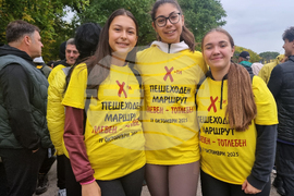 Плевен (11 октомври 2025) Близо 400 участници се включиха в десетото издание на пешеходния поход от Плевен до село Тотлебен, който традиционно преминава под наслова „Да слезем от колите и да повървим пеша“. Началото на маршрута бе при местността "Кожухарската чешма" край Плевен, финалът ще е в центъра на селото. На снимката (от ляво надясно): ученичките от Плевен София, Радослава и Александра, които за първи път участват в похода.