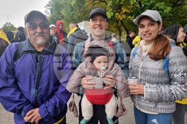 Плевен (11 октомври 2025) Близо 400 участници се включиха в десетото издание на пешеходния поход от Плевен до село Тотлебен, който традиционно преминава под наслова „Да слезем от колите и да повървим пеша“. Началото на маршрута бе при местността "Кожухарската чешма" край Плевен, финалът ще е в центъра на селото. На снимката (от ляво надясно): един от най-възрастните участници в похода 71-годишният Кирил Веков и семейството на Албена Танчева и Владимир Матеев, които са заедно с петмесечния им син Калоян.