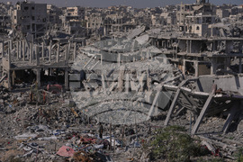 Destroyed buildings in the Gaza Strip are seen from a southern Israel location on Saturday, Oct. 11, 2025, as part of the preparations surrounding the expected release of hostages under the agreement between Hamas and Israel to pause the war and free the remaining captives. (AP Photo/Ohad Zwigenberg)