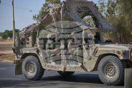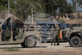Israeli army vehicle are seen near a military base ahead of the expected release of hostages, near Kibbutz Reim in southern Israel, Saturday, Oct. 11, 2025, as part of the agreement between Hamas and Israel to pause the war and release the remaining captives. (AP Photo/Ohad Zwigenberg)