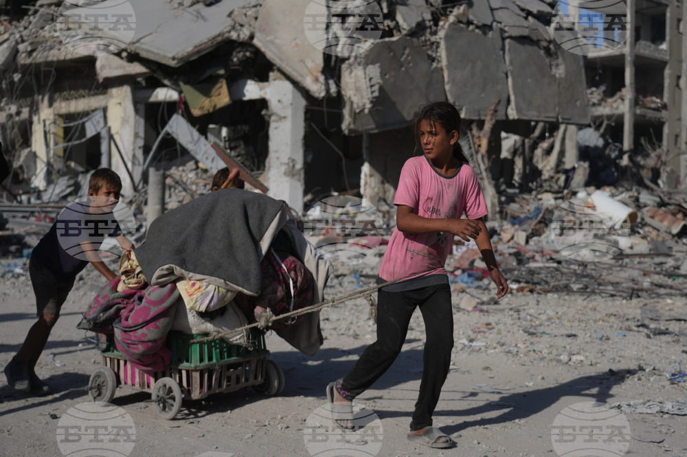 Displaced Palestinian children pull a cart loaded with belongings as they walk along the heavily damaged Al-Jalaa Street in Gaza City, Saturday, Oct. 11, 2025, after Israel and Hamas agreed to a pause in their war and the release of the remaining hostages. (AP Photo/Abdel Kareem Hana)