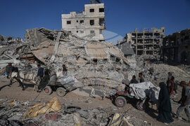 Displaced Palestinians ride donkey carts loaded with belongings past destroyed buildings in Gaza City, Saturday, Oct. 11, 2025, after Israel and Hamas agreed to a pause in their war and the release of the remaining hostages. (AP Photo/Abdel Kareem Hana)