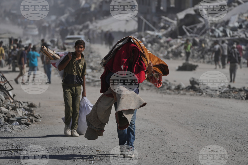 Displaced Palestinians carry their belongings as they walk along the heavily damaged Al-Jalaa Street in Gaza City, Saturday, Oct. 11, 2025, after Israel and Hamas agreed to a pause in their war and the release of the remaining hostages. (AP Photo/Abdel Kareem Hana)