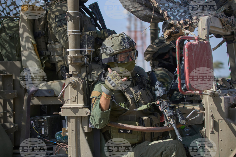 An Israeli army vehicle moves along the border of the Gaza strip, as seen from a southern Israel location on Saturday, Oct. 11, 2025, as part of the preparations surrounding the expected release of hostages under the agreement between Hamas and Israel to pause the war and free the remaining captives. (AP Photo/Ohad Zwigenberg)