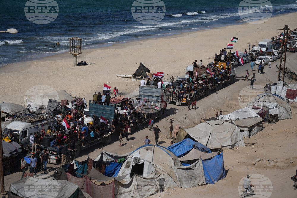 Displaced Palestinians ride on trucks loaded with belongings and wave Egyptian and Palestinian flags as they travel along the coastal road near Wadi Gaza in the central Gaza Strip, moving toward Gaza city, Saturday, Oct. 11, 2025, after Israel and Hamas agreed to a pause in their war and the release of the remaining hostages. (AP Photo/Jehad Alshrafi)