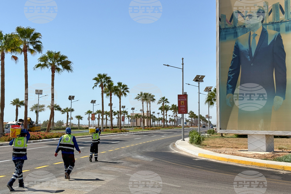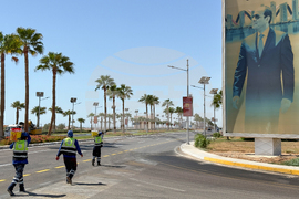 Workers paint a traffic line at the Red Sea city of Sharm el-Sheikh, Egypt, Saturday, Oct. 11, 2025, where President Donald Trump is expected to hold a summit of world leaders on Gaza during his visit to Egypt. (AP Photo)