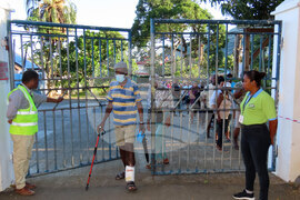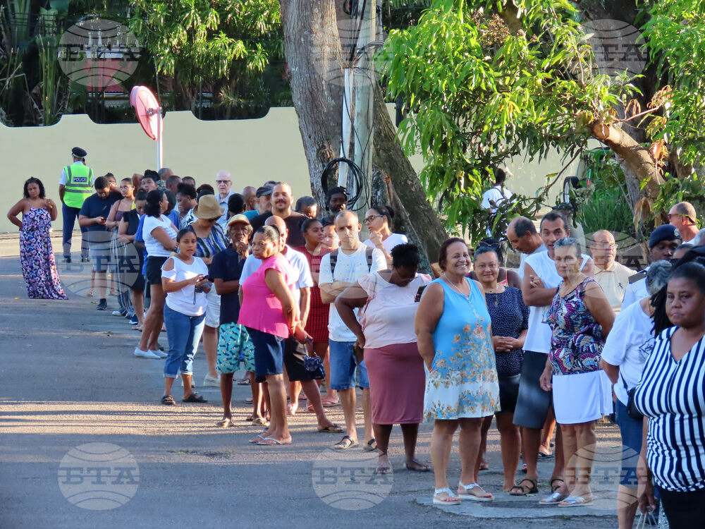 People line up to cast their votes in a runoff presidential election at Mont Fleuri Secondary School, Mont Fleuri, Mahe, Seychelles, Saturday, Oct. 11, 2025. (AP Photo/Emilie Chetty)