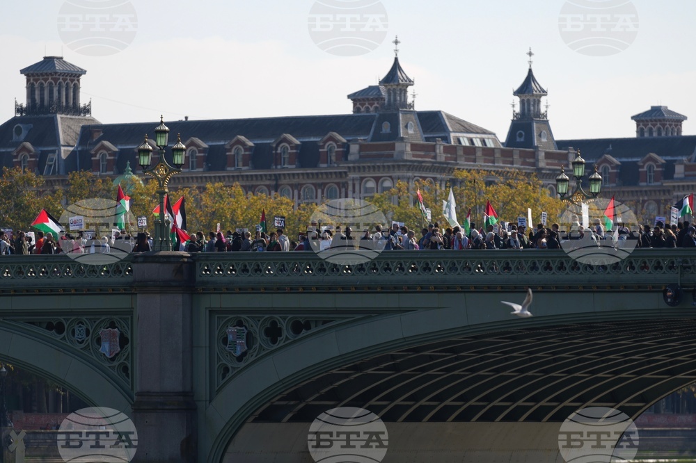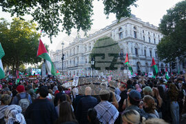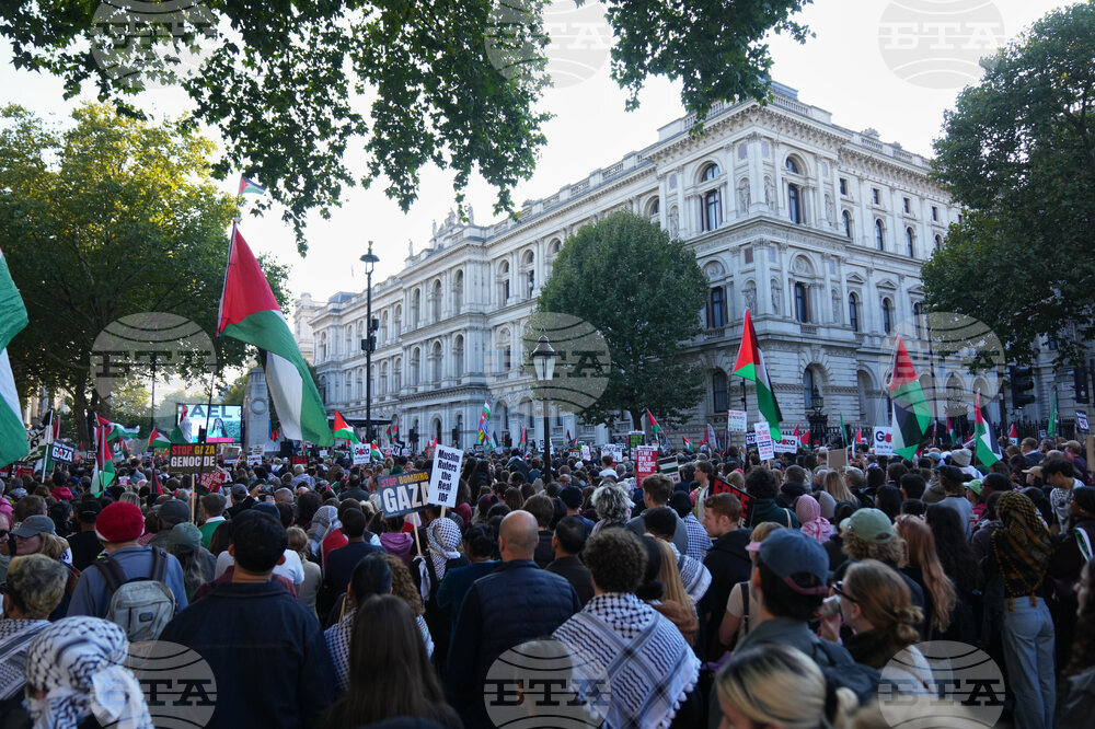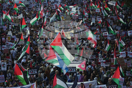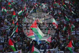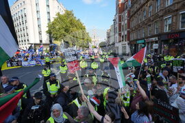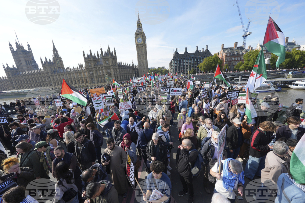People attend a pro Palestinian march through central London, Saturday, Oct. 11, 2025 . (AP Photo/Joanna Chan)