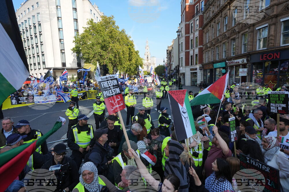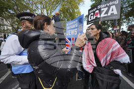 People on the Strand march past a demonstrators at a counter protest organised by Stop The Hate (background), as they take part in a Palestine Solidarity Campaign march in central London, Saturday, Oct. 11, 2025. (Yui Mok/PA via AP)