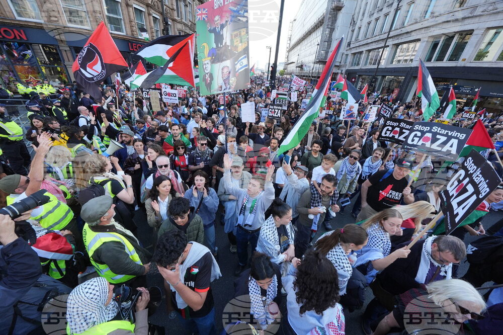 Demonstrators take part in a pro Palestinian march in central London, Saturday, Oct. 11, 2025. (Yui Mok/PA Wire/PA via AP)