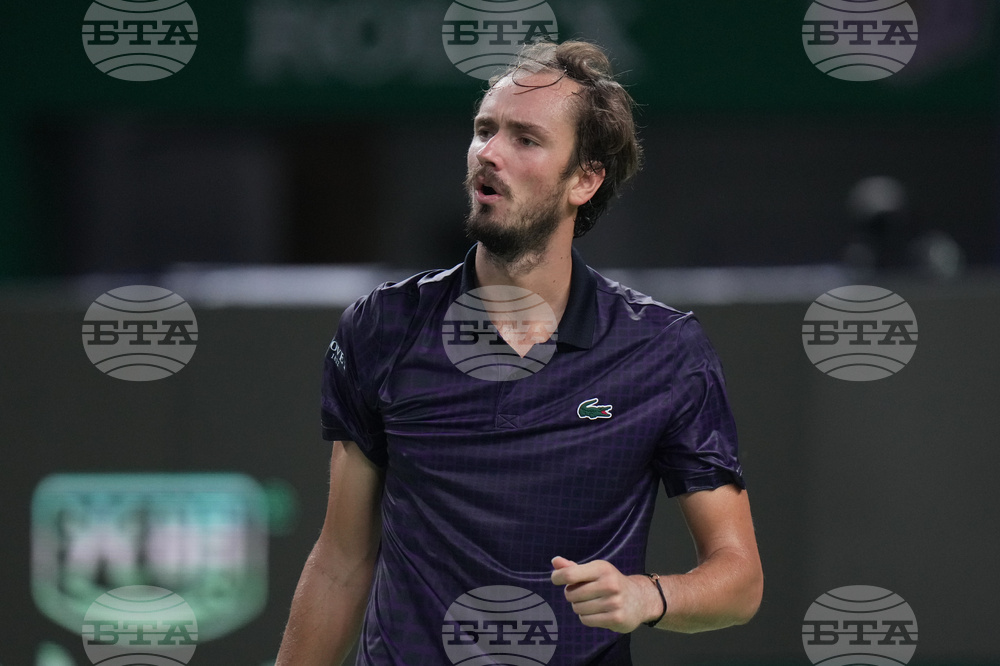 Daniil Medvedev, of Russia, eyes on the ball as he plays Arthur Rinderknech of France during their men's singles semifinal match of the Shanghai Masters tennis tournament at Qizhong Forest Sports City Tennis Center, in Shanghai, China, Saturday, Oct. 11, 2025. (AP Photo/Andy Wong)