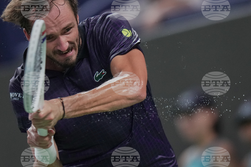 Sweats fly off from the hands of Daniil Medvedev of Russia as he returns to Arthur Rinderknech of France during their men's singles semifinal match of the Shanghai Masters tennis tournament at Qizhong Forest Sports City Tennis Center, in Shanghai, China, Saturday, Oct. 11, 2025. (AP Photo/Andy Wong)