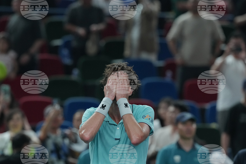 Arthur Rinderknech of France reacts after defeating Daniil Medvedev of Russia in their men's singles semifinal match of the Shanghai Masters tennis tournament at Qizhong Forest Sports City Tennis Center, in Shanghai, China, Saturday, Oct. 11, 2025. (AP Photo/Andy Wong)