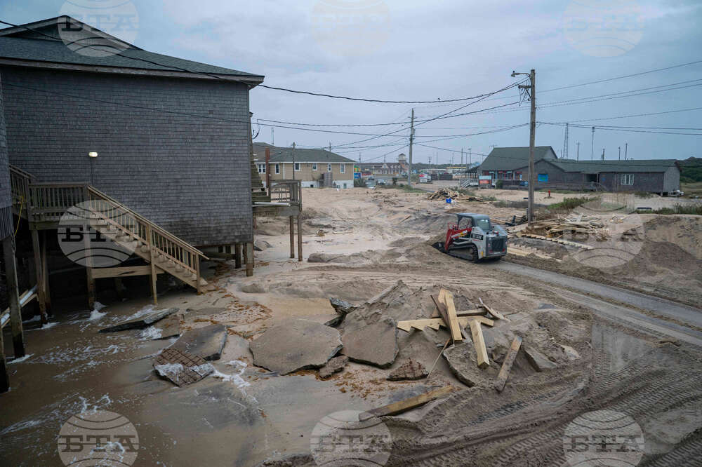 A machine moves sand as a protective measure at the Cape Hatteras Motel as a storm approaches, Saturday, Oct. 12, 2025, in Buxton, N.C. (AP Photo/Allison Joyce)