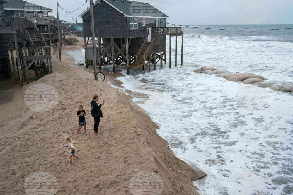 People stand on a protective sand barrier as a storm approaches, Saturday, Oct. 11, 2025, in Buxton, N.C. (AP Photo/Allison Joyce)