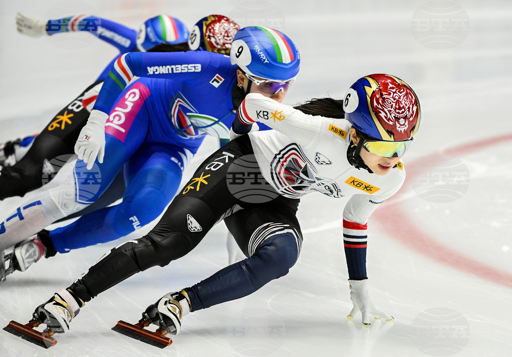 South Korea's Gilli Kim of (6) skates ahead of the pack during the 1000-meter quarterfinal race at the ISU Short Track World Tour Speedskating event in Montreal, Saturday, Oct. 11, 2025. (Graham Hughes/The Canadian Press via AP)