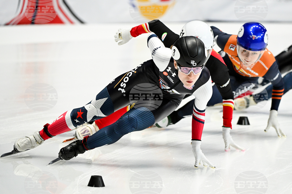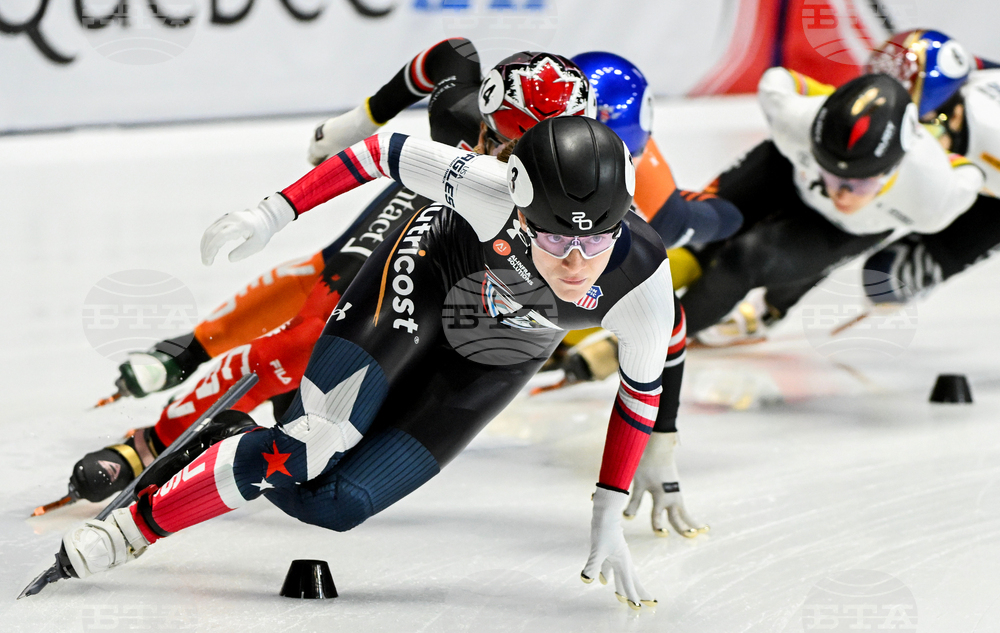 United States' Corinne Stoddard (3) skates during the 1000-meter quarterfinal race at the ISU Short Track World Tour Speedskating event in Montreal, Saturday, Oct. 11, 2025. (Graham Hughes/The Canadian Press via AP)