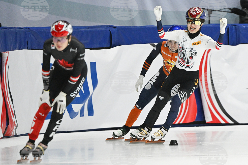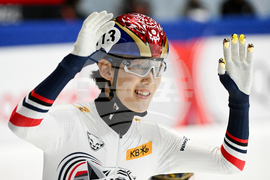 Kim Gilli of South Korea, right, reacts after leading her team to victory in the women's 3000m relay final at the ISU Short Track World Tour speedskating event in Montreal, Saturday, Oct. 11, 2025. (Graham Hughes/The Canadian Press via AP)