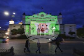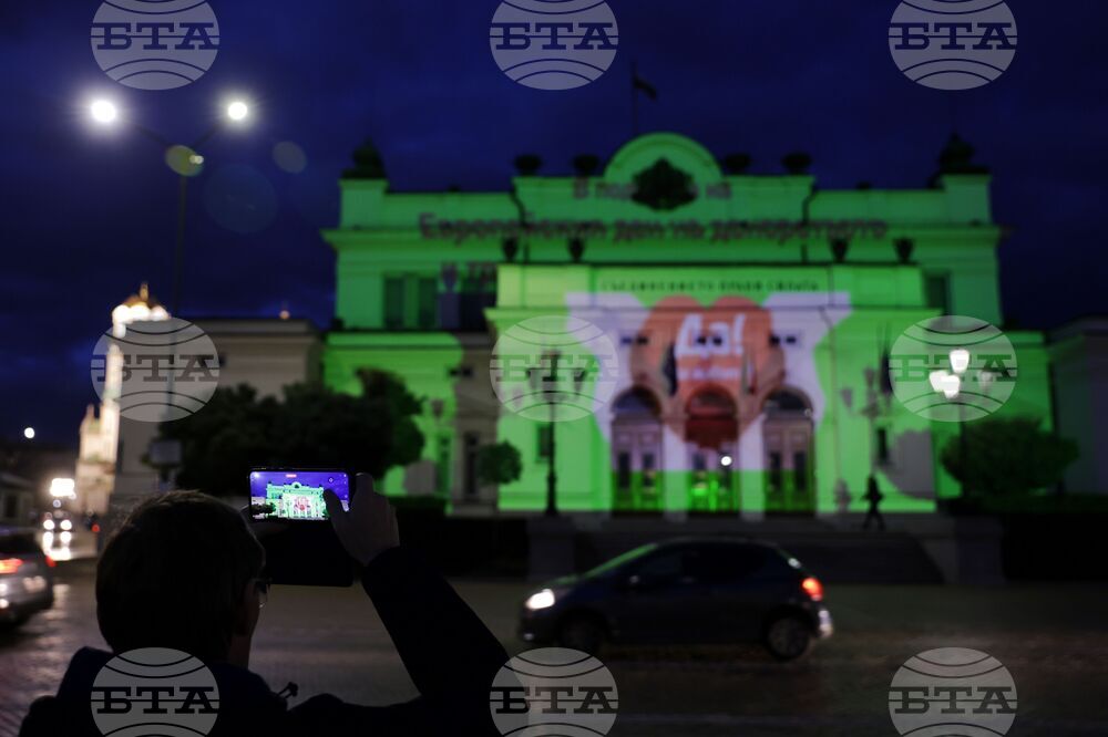 София (11 октомври 2025) Фасадата на историческата сграда на Парламента на пл. „Народно събрание“ 2 е осветена в зелено по повод Европейския ден на донорството и трансплантацията на органи.