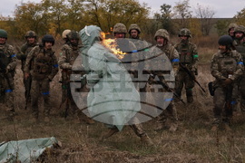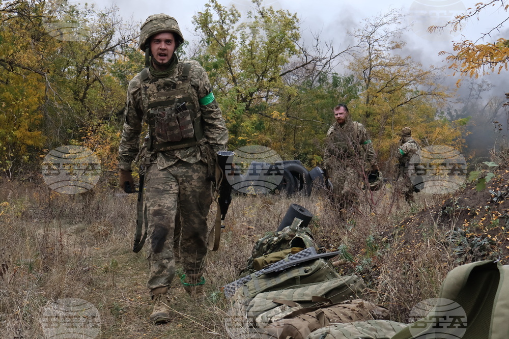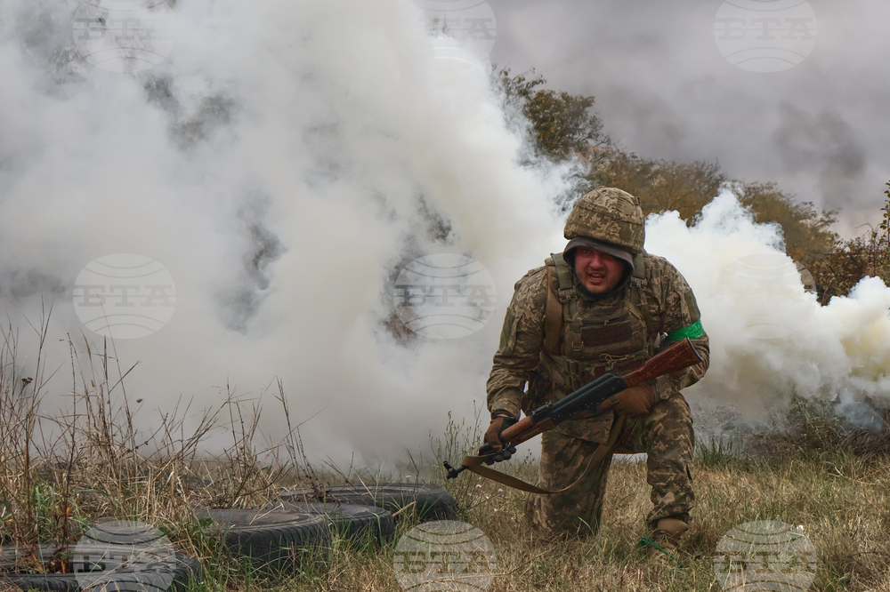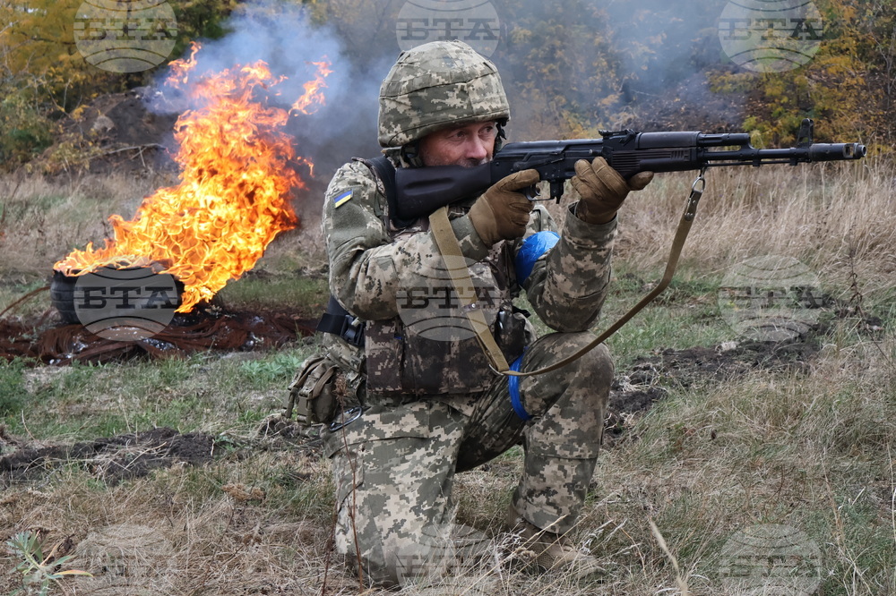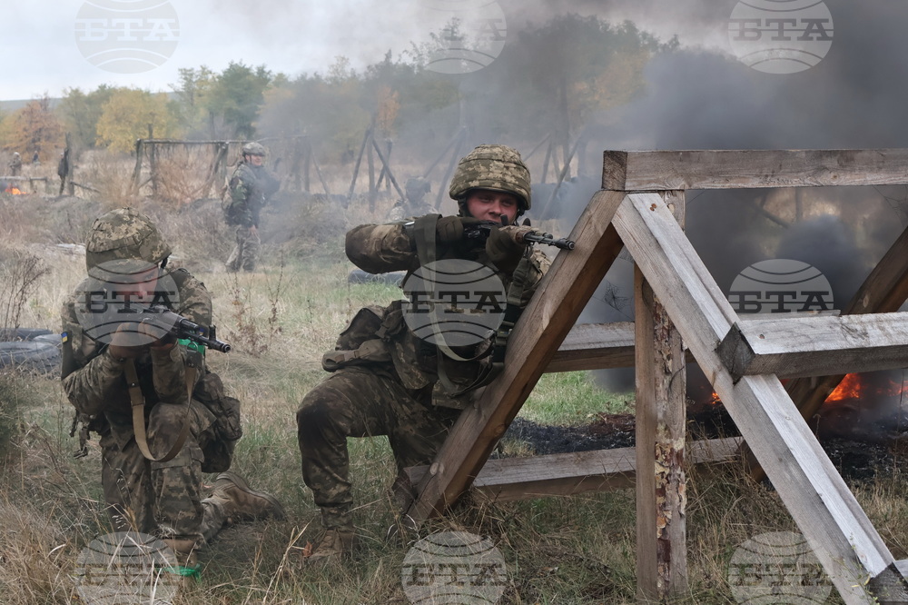 In this photo provided by Ukraine's 65th Mechanized Brigade press service, recruits attend drills at a training ground in the Zaporizhzhia region, Ukraine, Saturday, Oct. 11, 2025. (Andriy Andriyenko/Ukraine's 65th Mechanized Brigade via AP)