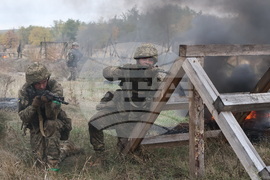 In this photo provided by Ukraine's 65th Mechanized Brigade press service, a recruit attends drills at a training ground in the Zaporizhzhia region, Ukraine, Saturday, Oct. 11, 2025. (Andriy Andriyenko/Ukraine's 65th Mechanized Brigade via AP)