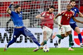 Dominik Szoboszlai, center, and Loic Nego, right, of Hungary in action against Nair Tiknizyan, left, and Vahan Bichakhchyan of Armenia during the World Cup Qualifiers Group F soccer match between Hungary and Armenia at the Puskas Arena in Budapest, Hungary, Saturday, Oct. 11, 2025. (Tibor Illyes/MTI via AP)