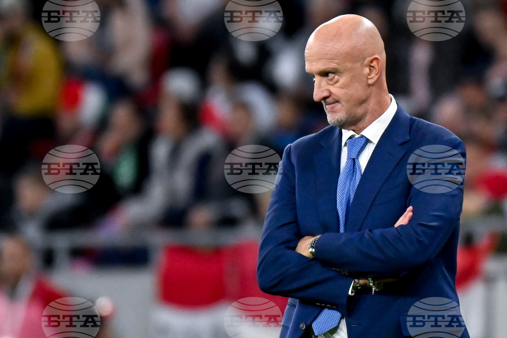 Hungary's head coach Marco Rossi looks on during a World Cup qualifying group F soccer match between Hungary and Armenia in Puskas Arena in Budapest, Hungary, Saturday, Oct. 11, 2025. (Tibor Illyes/MTI via AP)