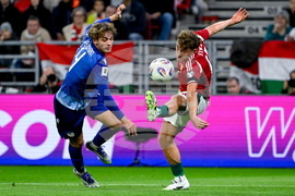 Hungary's Bendeguz Bolla, left, heads the ball in front of Armenia's Nair Tiknizyan during a World Cup qualifying group F soccer match between Hungary and Armenia in Puskas Arena in Budapest, Hungary, Saturday, Oct. 11, 2025. (Tibor Illyes/MTI via AP)