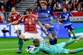 Daniel Lukacs of Hungary scores during a World Cup qualifying group F soccer match between Hungary and Armenia in Puskas Arena in Budapest, Hungary, Saturday, Oct. 11, 2025. (Tibor Illyes//MTI via AP)